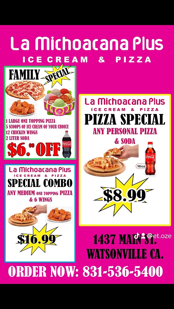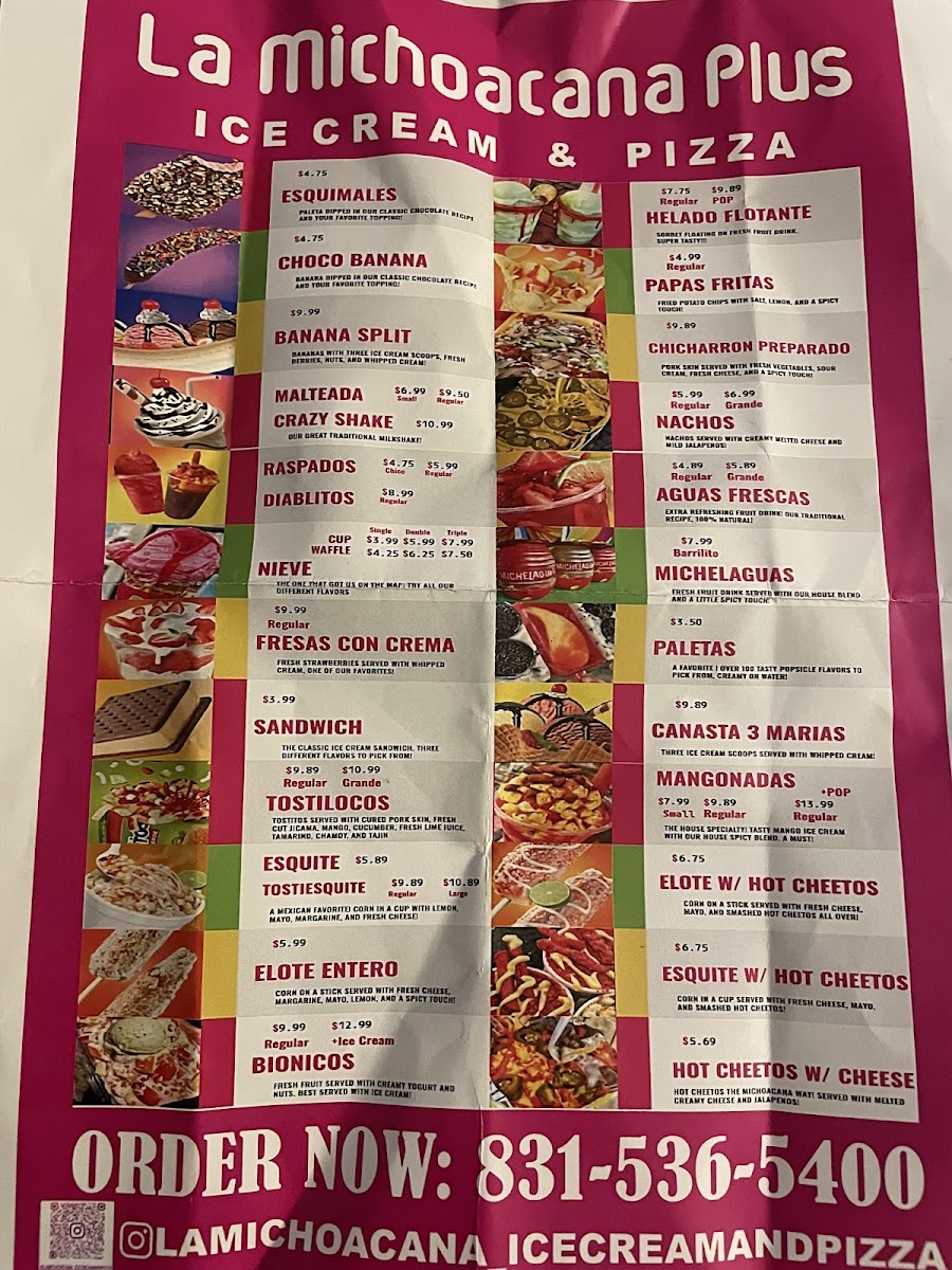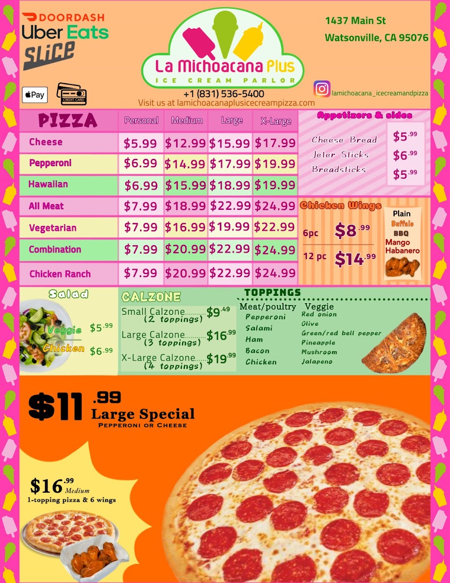 The menu at La Michoacana Plus Pizza Cre offers a refreshing mix of beverages and light bites, perfect for anyone looking for a tasty treat. The Michelaguas are a standout, with unique options like Michelagua de Mango, Pepino con Limón y Chía (Cucumber with Lemon & Chia), and Limonada de Fresa (Strawberry Lemonade), each delivering a burst of flavor. Additionally, the restaurant serves Aguas Frescas, which includes a variety of fresh fruit and flavored drinks like Pepino con Limón y Chía (Cucumber with Lemon & Chia Seeds), Limonada de Fresa (Strawberry Lemonade), Limon con Chía (Lemonade with Chia Seeds), Mango, and Sandía (Watermelon). These drinks are not only delicious but also offer a refreshing escape on a warm day. Each beverage brings a blend of natural fruit flavors, providing a delightful end to a meal or a refreshing drink to enjoy any time of day.